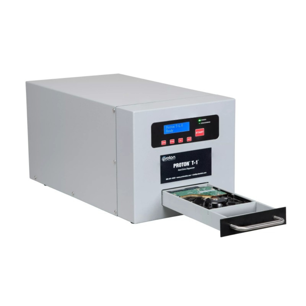The Proton T-1 is a drawer style degausser that destroys data on hard drives and other magnetic media to help organizations protect sensitive information and stay in compliance with various Government regulations for data sanitization. The T-1 is automatic, light weight and simple to use so it will fit easily into existing operations.